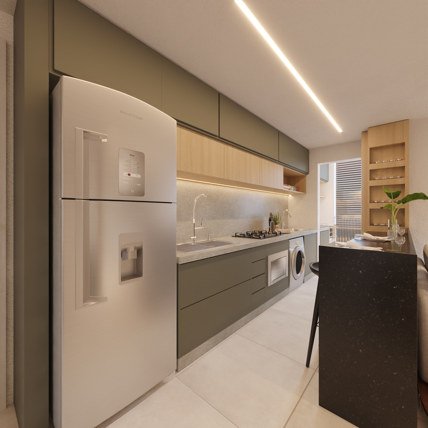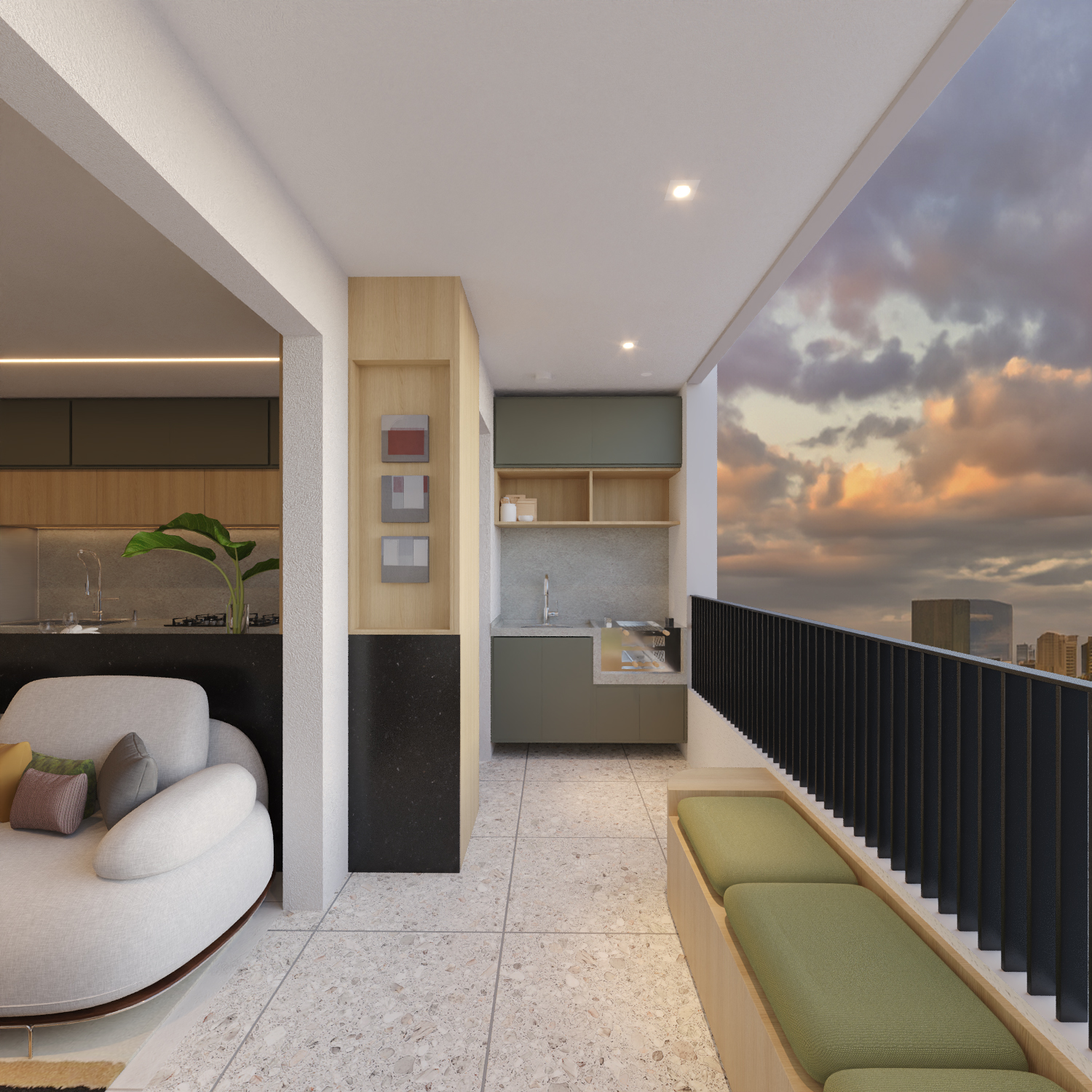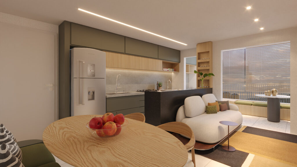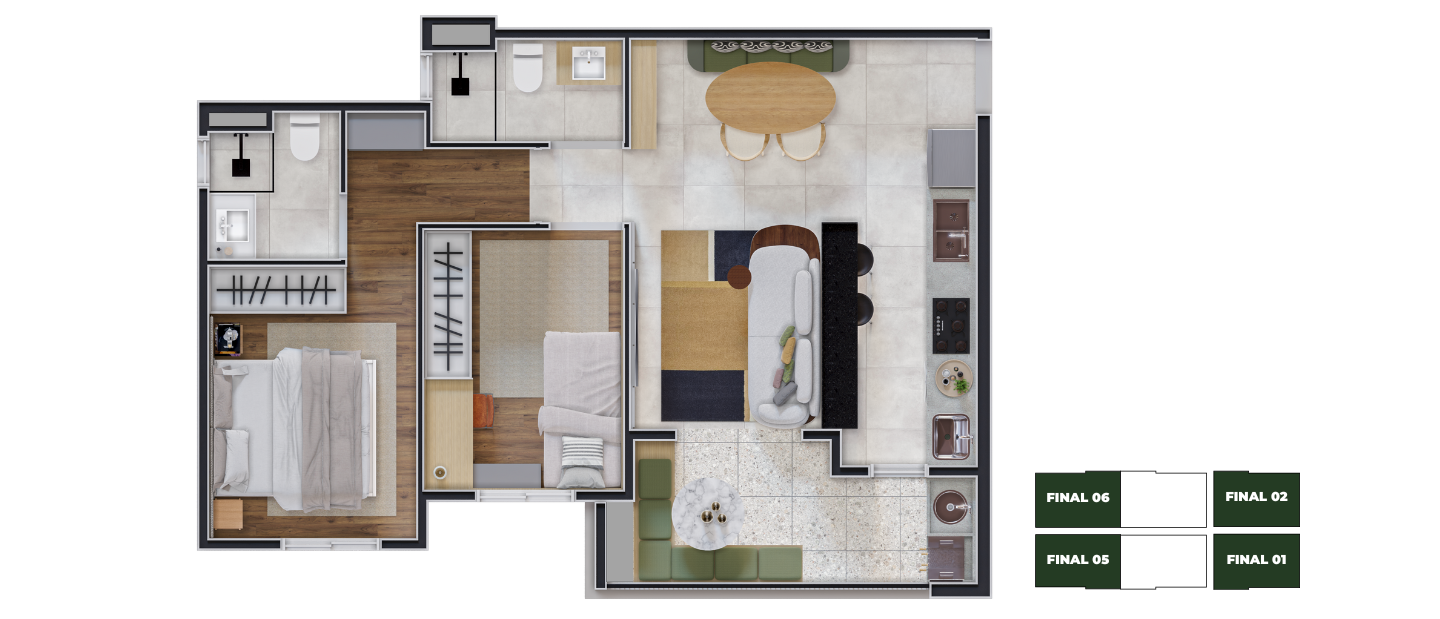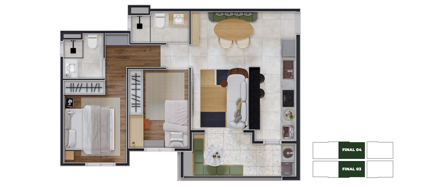 PLANTAS 57,15M² E 60,40M² COM 2 DORMITÓRIOS, SENDO UMA SUÍTE, SACADA GOURMET COM CHURRASQUEIRA ECOLÓGICA, COZINHA AMERICANA, ÁREA DE SERVIÇO, LIVING COM SALA DE ESTAR, SALA DE JANTAR E BANHEIRO